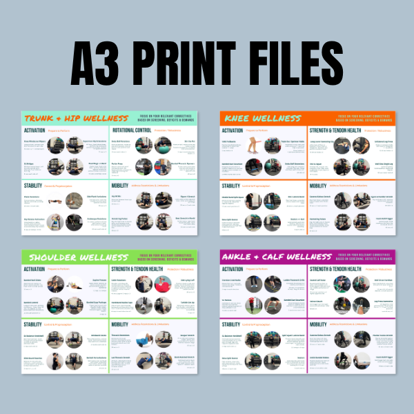 Level up your clinic or gym wall with these A3 corrective exercise prints—functional, visual, and designed to keep movement quality front of mind. Perfect for physios, therapists, and teams, these posters make teaching, cueing, and progressing athletes easier than ever. Practical knowledge that looks good on the wall.
